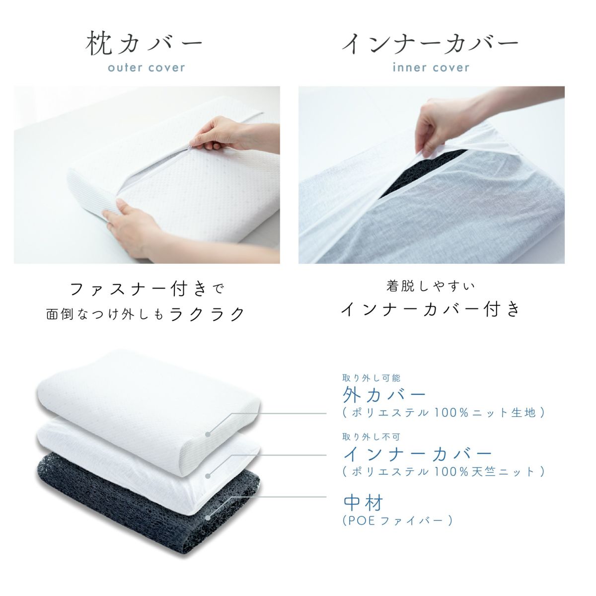 外側カバーはもちろん、中材も洗えます。外側を覆うカバーは丸洗いOK!いつまでも清潔が続きます。