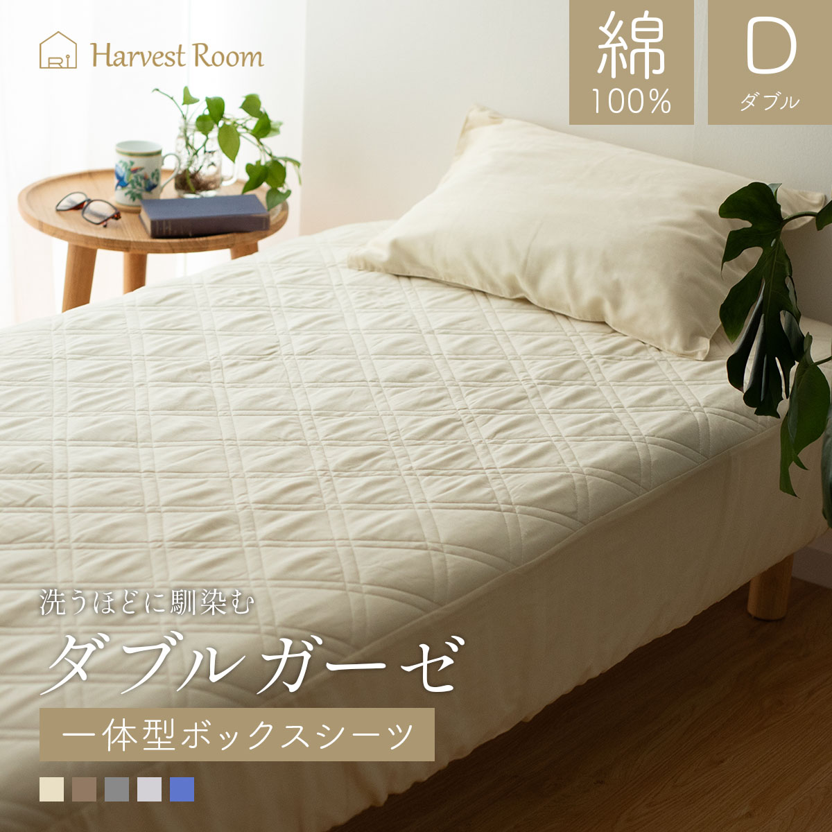 HarvestRoom 優しい肌触り!コットン100%で安心!使えば使うほどに私好みのカバーに育つダブルガーゼ ダブルガーゼ パッド一体型 ボックスシーツ ダブル