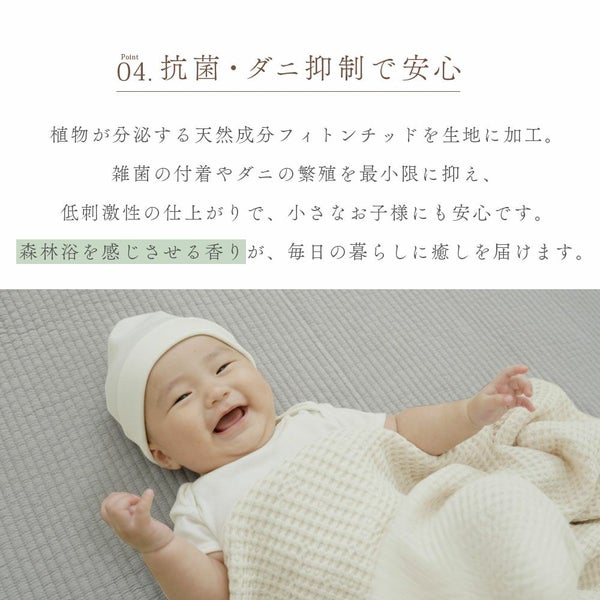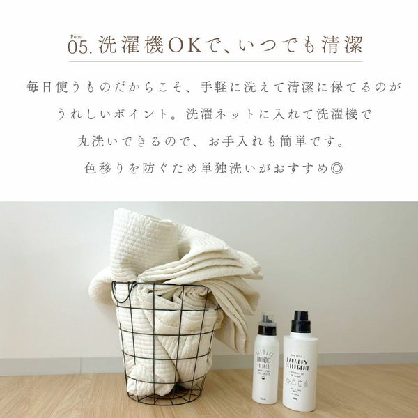 吸湿性と通気性に優れていて、ご家庭で丸洗いもできるので、いつでも清潔な状態が保てて衛生面の心配なし!また乾きやすいのも特徴です。