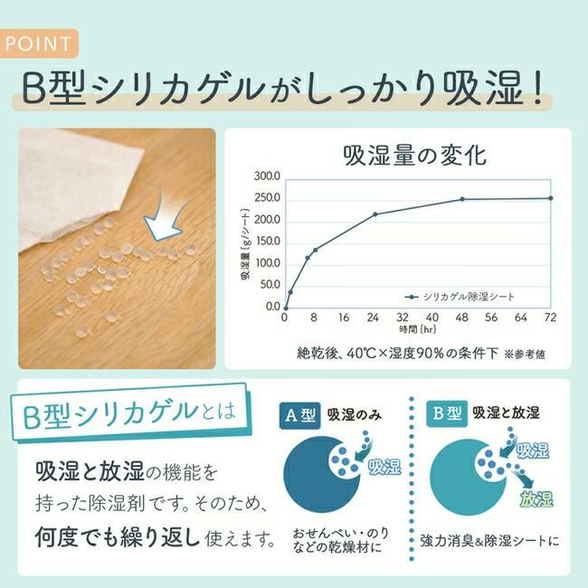 布団やマットレスの下に敷いたり、押し入れの収納時など、湿気やカビが気になる場所の湿気をB型シリカゲルがグングン吸収します!