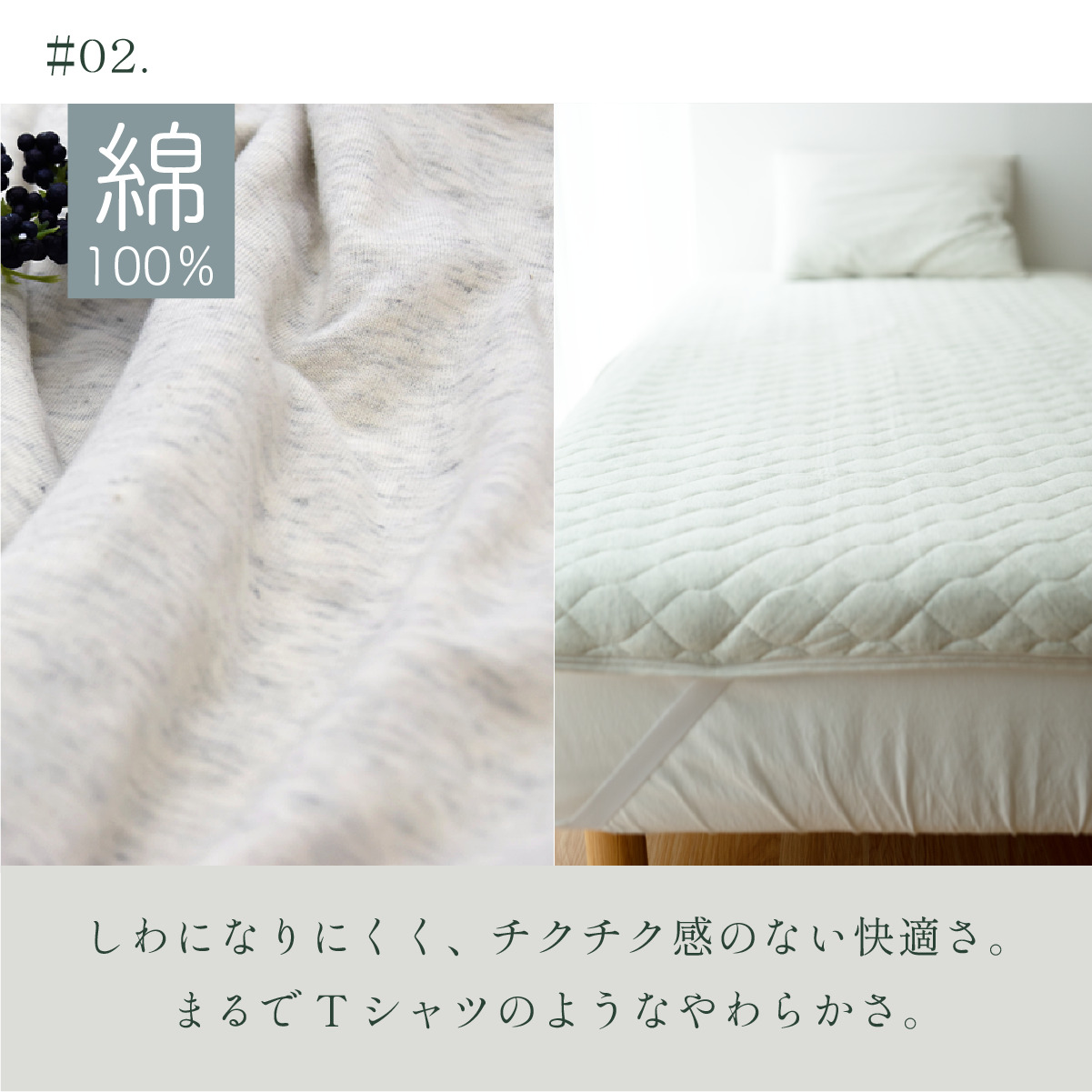 しっかり汗を吸収して、ムレにくい。吸放湿性にすぐれた綿100%素材。睡眠中の汗をしっかり吸収してくれる。