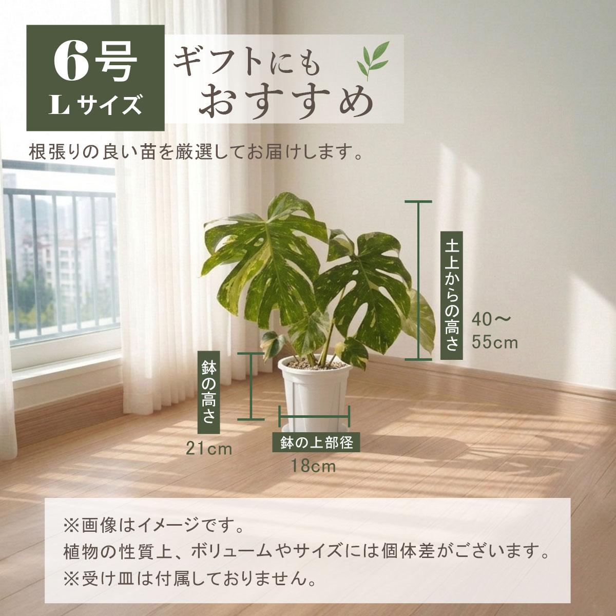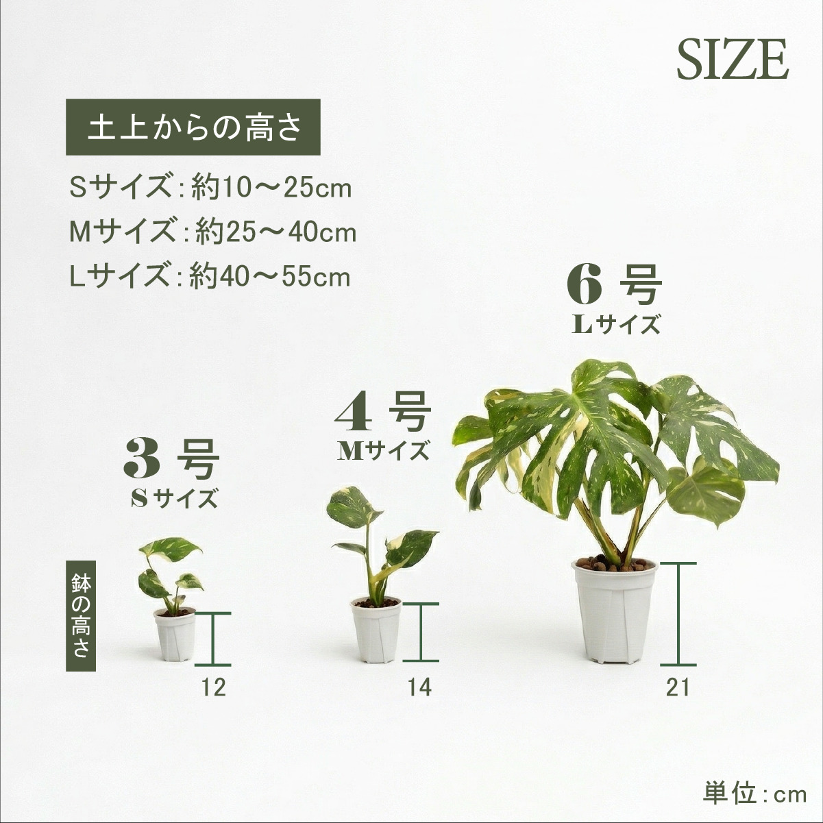 植物の性質上、サイズやボリュームには個体差がございますので、目安としてご参考ください。