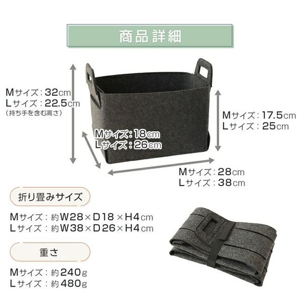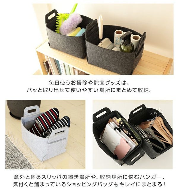 折りたためる!柔らかいフェルト素材の収納BOX!持ち運びに便利な持ち手付き!シンプルなデザインで、カラーはインテリアに馴染みやすいグレーとチャコール。 フェルト収納バスケット M・L 【2個セット】