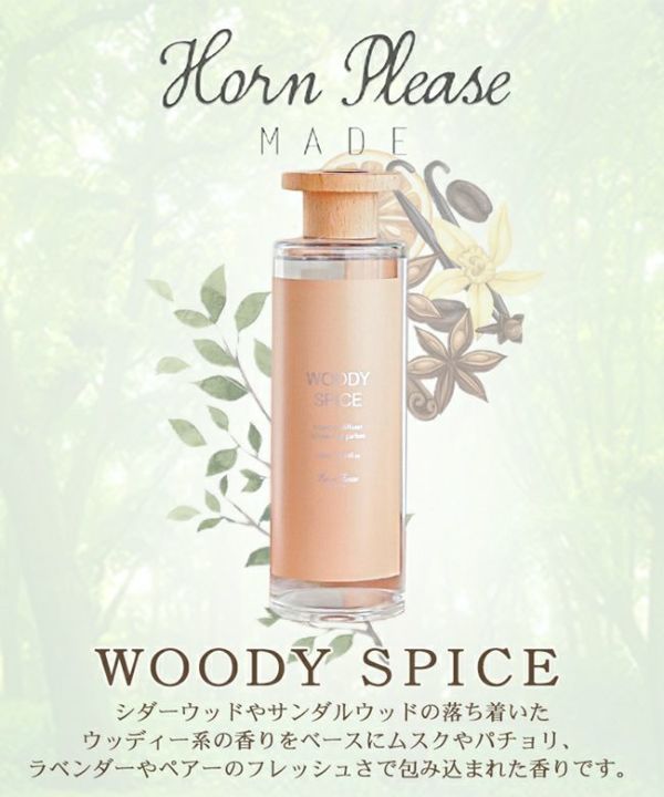 【WOODY SPICE(ウッディスパイス)】シダーウッドやサンダルウッドの落ち着いたウッディー系の香りをベースにムスクやパチョウリ、ラベンダーやペアーのフレッシュさで包み込まれた香りです。