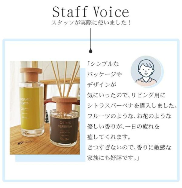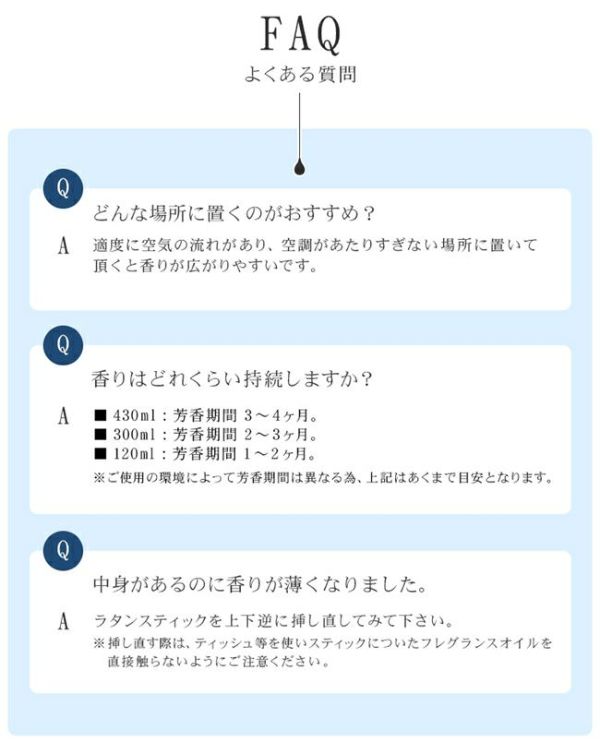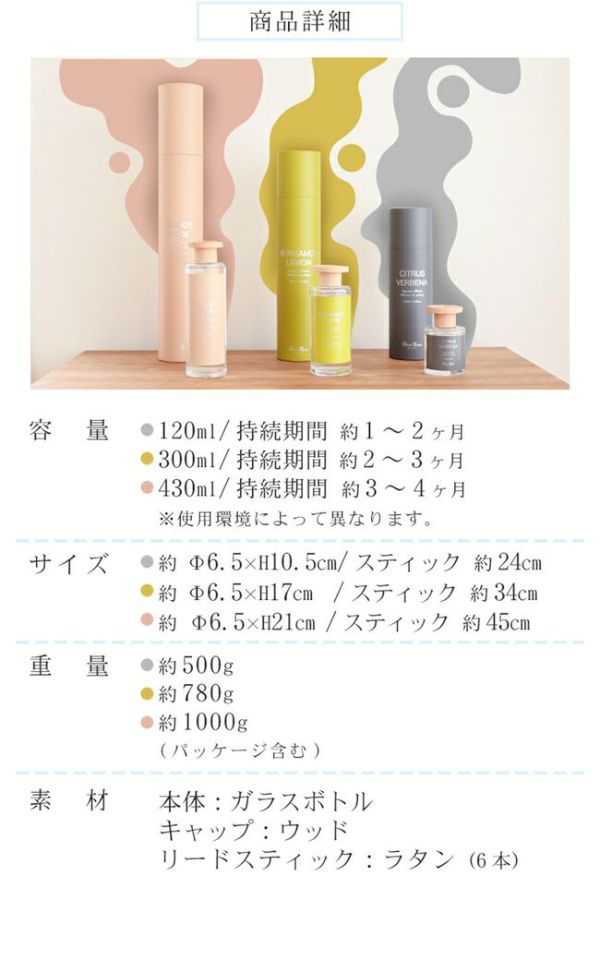 ・ボトルを倒さないよう気を付けてください。倒れると中のフレグランスオイルがこぼれ出ます。