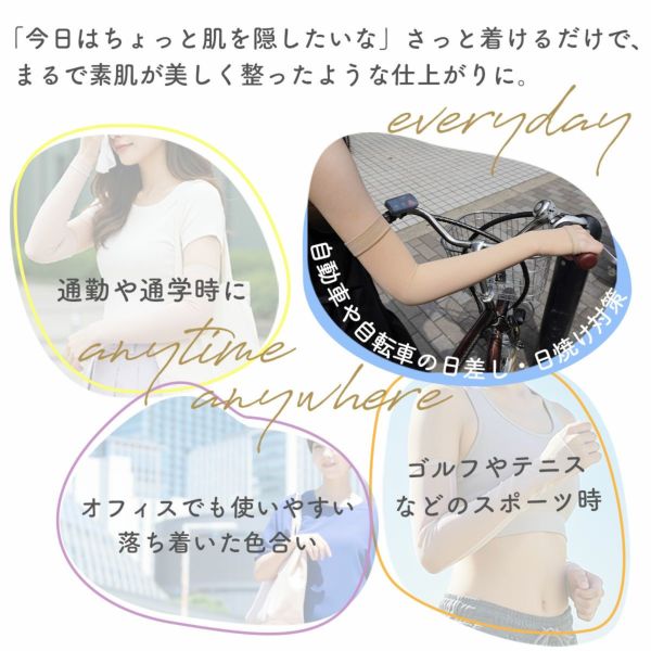 アームカバー、日差し対策、日焼け、夏、紫外線、腕、肌、美肌、ファンデーション、極薄、接触冷感、冷房対策、ブルーベース、イエローベース、ブルベ、イエベ、メイクアップ、透け感、ベージュ、レディース、指穴あり