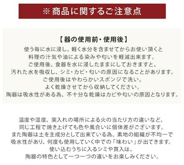 ご使用後はやわらかいスポンジで洗い、よく乾燥させてから収納してください。陶器は吸水性がある為、不十分な乾燥はカビや匂いの原因となります。