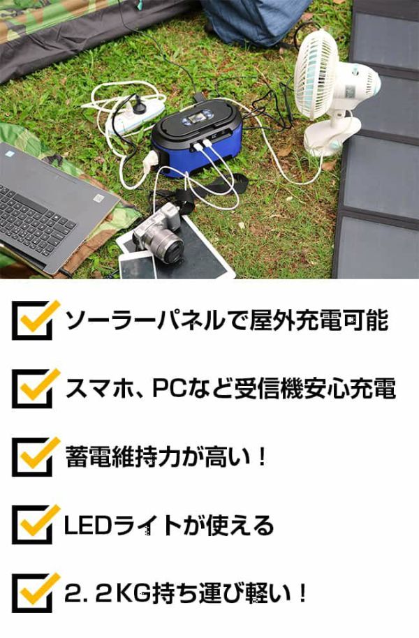ソーラーパネル(市販品) 約10~11時間(晴天時DC13~25V 最大2.5A)