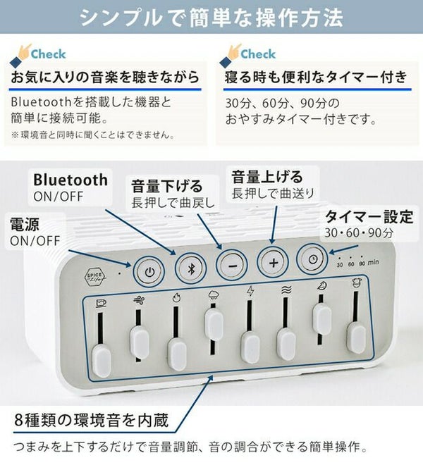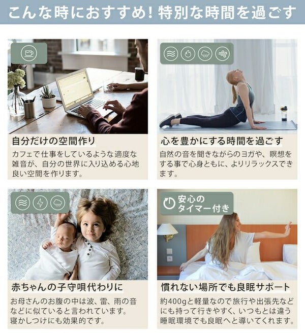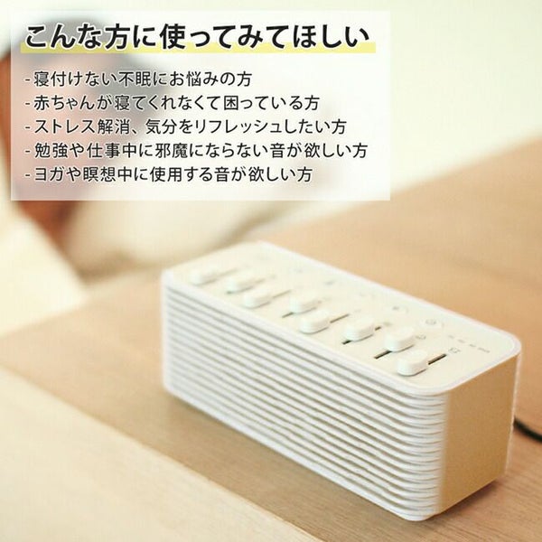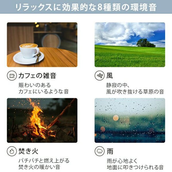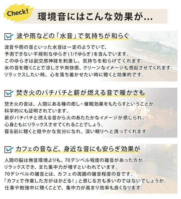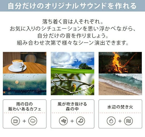 就寝時、外部の生活音や突発的な音など気になって眠れないことはありませんか? そんな音を別の音によって包み込み、気づきにくくさせるという方法があります。 使用する音は、音楽よりも一定に連続する音の方がリラックス空間を演出できると言われています。 飛行機や電車の揺れや音で眠れる現象とよく似ています。 おやすみノイズは一定のリズムの環境音を流し、良質な睡眠空間をサポートします。