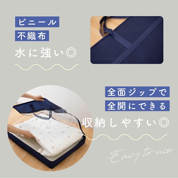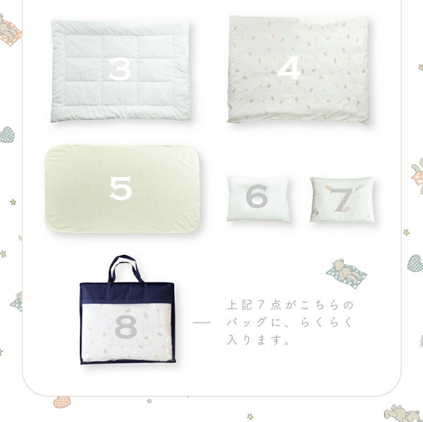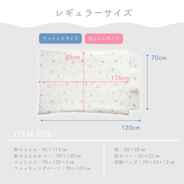 【サイズ】[掛け布団] 85×115㎝ [掛け布団カバー] 90×120cm [二つ折りマットレス] 70×120cm×3cm(厚さ) [フィッティングシーツ] 70×120cm×3cm(マチ) [枕中心] 28×20cm [枕カバー] 30×22cm [防水シーツ] 70×120cm [不織布バッグ] ー