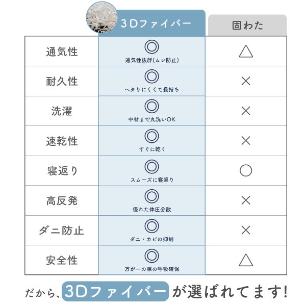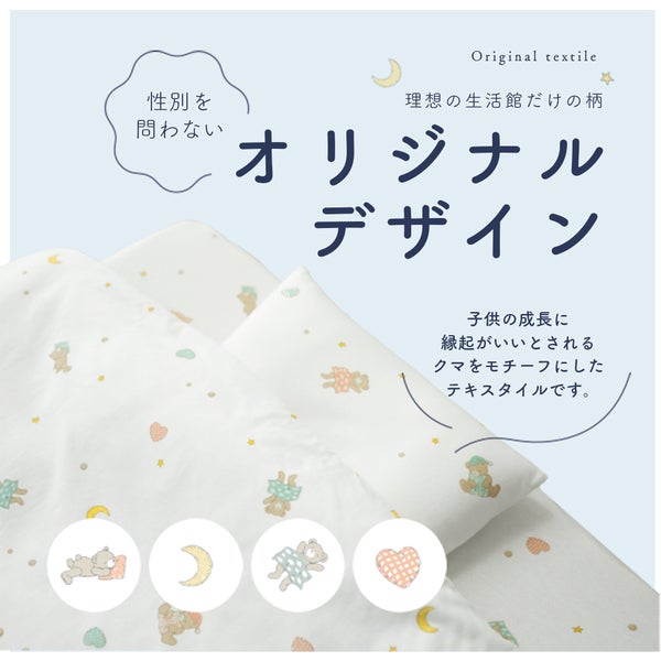 【素材】[掛け布団] ポリエステル100% / (詰め物)ポリエステル:200g [掛け布団カバー] 綿100%(天竺ニット) [二つ折りマットレス]  ー  [フィッティングシーツ]  綿100%(天竺ニット) [枕中心] ポリエステル100% [枕カバー] 綿100%(天竺ニット) [防水シーツ]