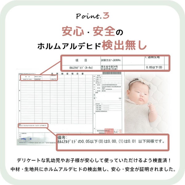 また、通気性もよく蒸れずにぐっすり眠りやすいのはもちろん!うつ伏せになっても呼吸ができるので、安心してお使い頂けます。さらに、ホルマリン検査にてホルマリンは検出されず安心安全にお使い頂けます。