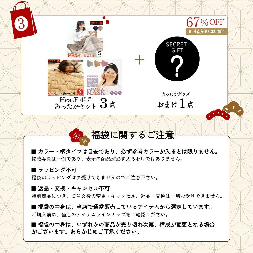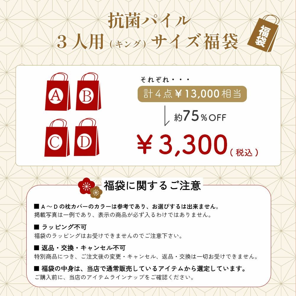 他の画像を見る MAX70%オフで超お得なあったか寝具の福袋。 今すぐ使える冬用アイテムが勢揃い! 福袋 2026 シングルサイズ おみくじ福袋 選べる ぽかぽか吸湿発熱福袋 フリース掛け布団カバー マイクロフリース敷きパッド フランネル毛布 ボア敷きパッド BOXシーツ Gift あったか寝具 冬限定 半額 SALE 数量限定 新春セール プレゼント ギフト 直販価格 ¥ 3,300 税込 詳細を見る お気に入りに登録する