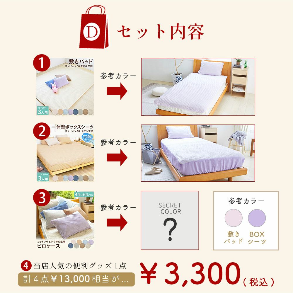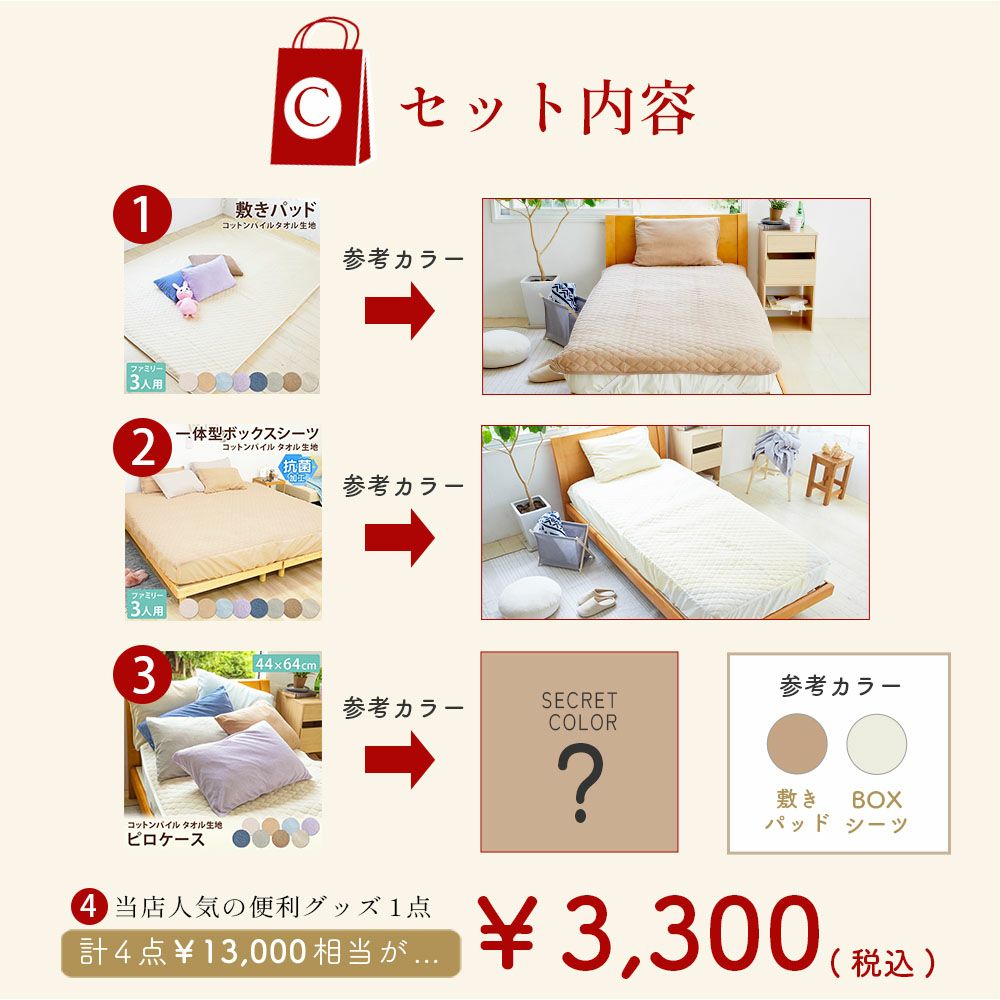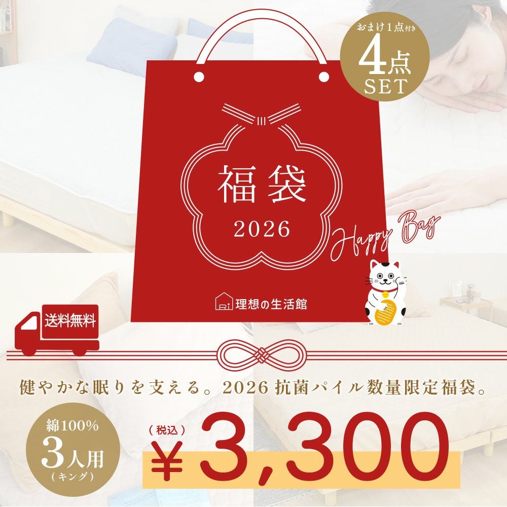 他の画像を見る 綿100%の抗菌タオル地の敷きパッド/ボックスシーツの福袋を お正月だけの限定価格でご用意しました! 福袋 2026 敷きパッド ボックスシーツ 3人用 ファミリーサイズ 選べる 綿100% 抗菌パイル 半額以下 お得 寝具 冬限定 送料無料 数量限定 セット タオル地 清潔 快適 洗える Gift ふわふわ 人気ランキング 新春セール プレゼント ギフト キングサイズ 200×200cm 直販価格 ¥ 3,300 税込 詳細を見る お気に入りに登録する